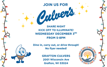 Help us kick off this Illuminate Ozaukee Season with a Dine to Donate Event at Culver's! Ozaukee Nonprofit Center will receive 15% of sales in this timeframe, plus 15% of gift card sales all day long.