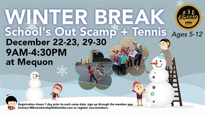Come join us for Elite's School Out Scamp over winter break. You will receive a tennis lesson on Monday and Tuesday of each week. You will also swim each day, make new friends, and enjoy fun activities. Sign up by emailing kids@eliteclubs.com